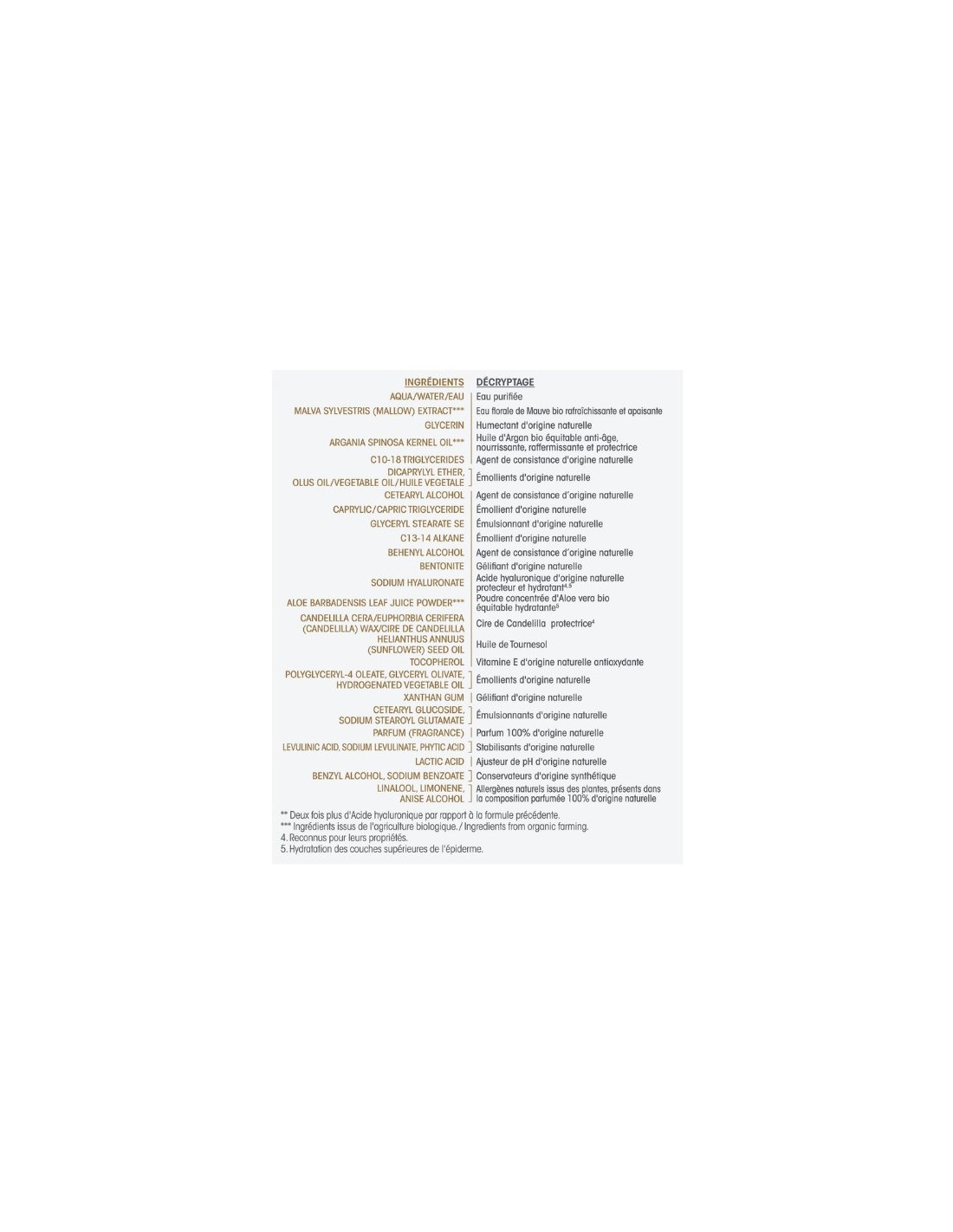 Aqua / Water /Eau, Malva Sylvestris (Mallow) Extract* Glycerin, Argania Spinosa Kernel Oil* C10-18 Triglycerides, Dicaprylyl Ether, Olus Oil / Vegetable Oil / Huile Vegetale, Cetearyl Alcohol, Caprylic / Capric Triglyceride, Glyceryl Stearate Se, C13-14 Alkane, Behenyl Alcohol, Bentonite, Sodium Hyaluronate, Aloe Barbadensis Leaf Juice Powder* Candelilla Cera /Euphorbia Cerifera (Candelilla) Wax/Cire De Candelilla, Helianthus Annuus (Sunflower) Seed Oil, Tocopherol, Polyglyceryl-4 Oleate, Glyceryl Olivate, Hydrogenated Vegetable Oil, Xanthan Gum, Cetearyl Glucoside, Sodium Stearoyl Glutamate, Parfum (Fragrance), Levulinic Acid, Sodium Levulinate, Phytic Acid, Lactic Acid, Benzyl Alcohol, Sodium Benzoate, Linalool, Limonene, Anise Alcohol