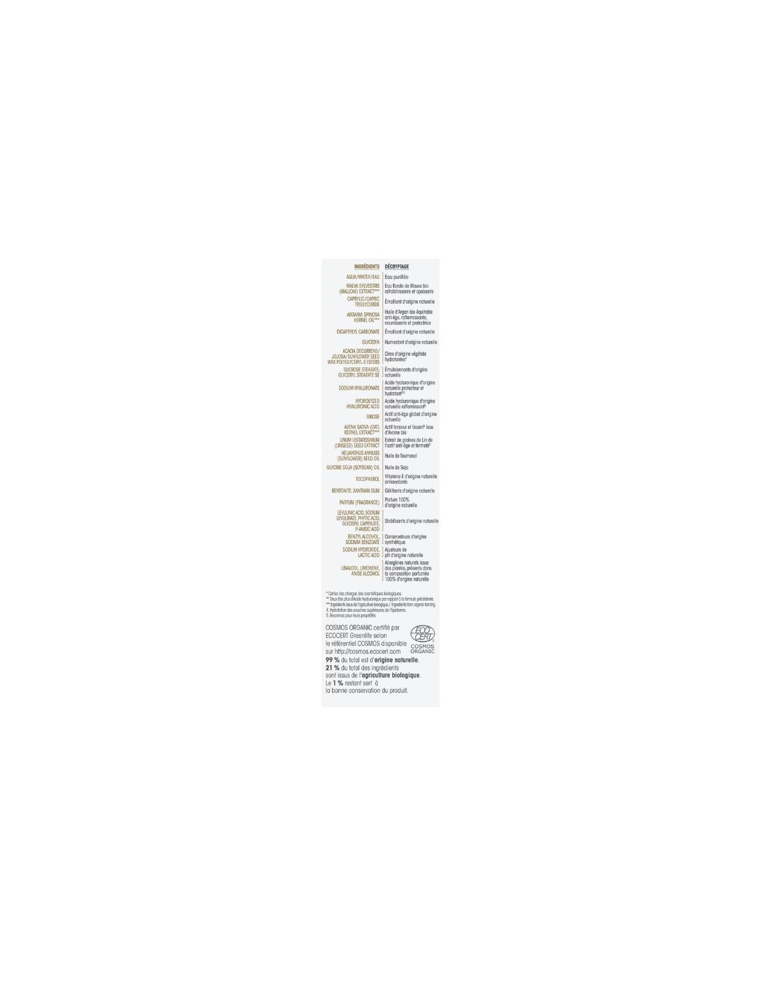 Aqua (Water), Malva Sylvestris (Mallow) Extract*, Glycerin, Argania Spinosa Kernel Extract*, Sodium Hyaluronate, Caprylyl/Capryryl Glucoside, Decyl Glucoside, Parfum, Leuvinic Acid, Sodium Levulinate, Benzyl Alcohol, Sodium Benzoate, Potassium Sorbate, Sodium Hydroxide, Lactic Acid, Linalool, Geraniol*procedentes de cultivo ecológico99% del total de los...