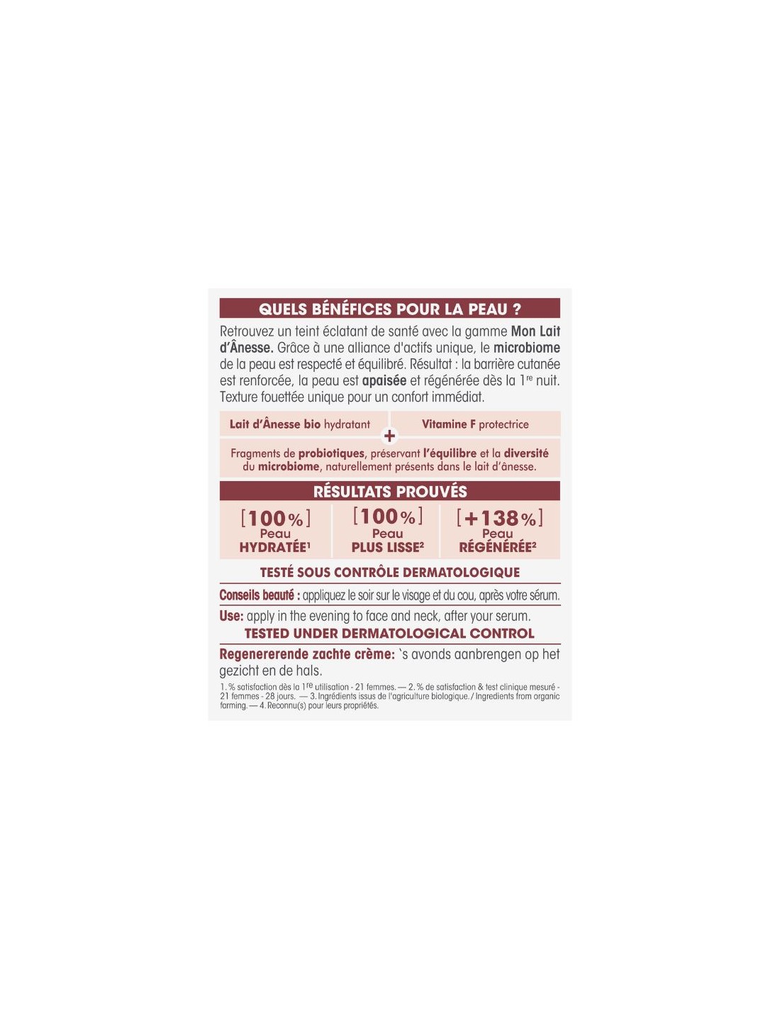 Aqua, Capric/Caprylic Triglyceride, Cetearyl Alcohol, Glycerin, Lacta Asinus (Donkey Milk)*, Hydrogenated Coconut Oil, Propandiol, Decyl Oleate, Dicaprylyl Carbonate, Cetyl Phosphate, Behenyl Alcohol, Lactobacillus Ferment, Lactobacillus Ferment Lysate, Aloe Barbadensis (Aloe Vera) Leaf Juice Powder*, Linolenic Acid, Stearic Acid, Palmitic Acid, Oleic Acid, Linoleic Acid, Arginin, Helianthus Annuus (Sunflower) Seed Oil, Tocopherol, Coco Caprylate, Triheptanoin, C9-12 Alkane, Gellan Gum, Cellulose, Dilinoleic Acid/Butanediol Copolymer, Castor Oil/Ipdi Copolymer, Cellulose Gum, Sodium Stearoyl Glutamate, Parfum (Fragrance), Levulinic Acid, Sodium Levulinate, Phytic Acid, Benzyl Alcohol, Sodium Benzoate, Citric Acid, Linalool, Vanillin, Benzaldehyde.