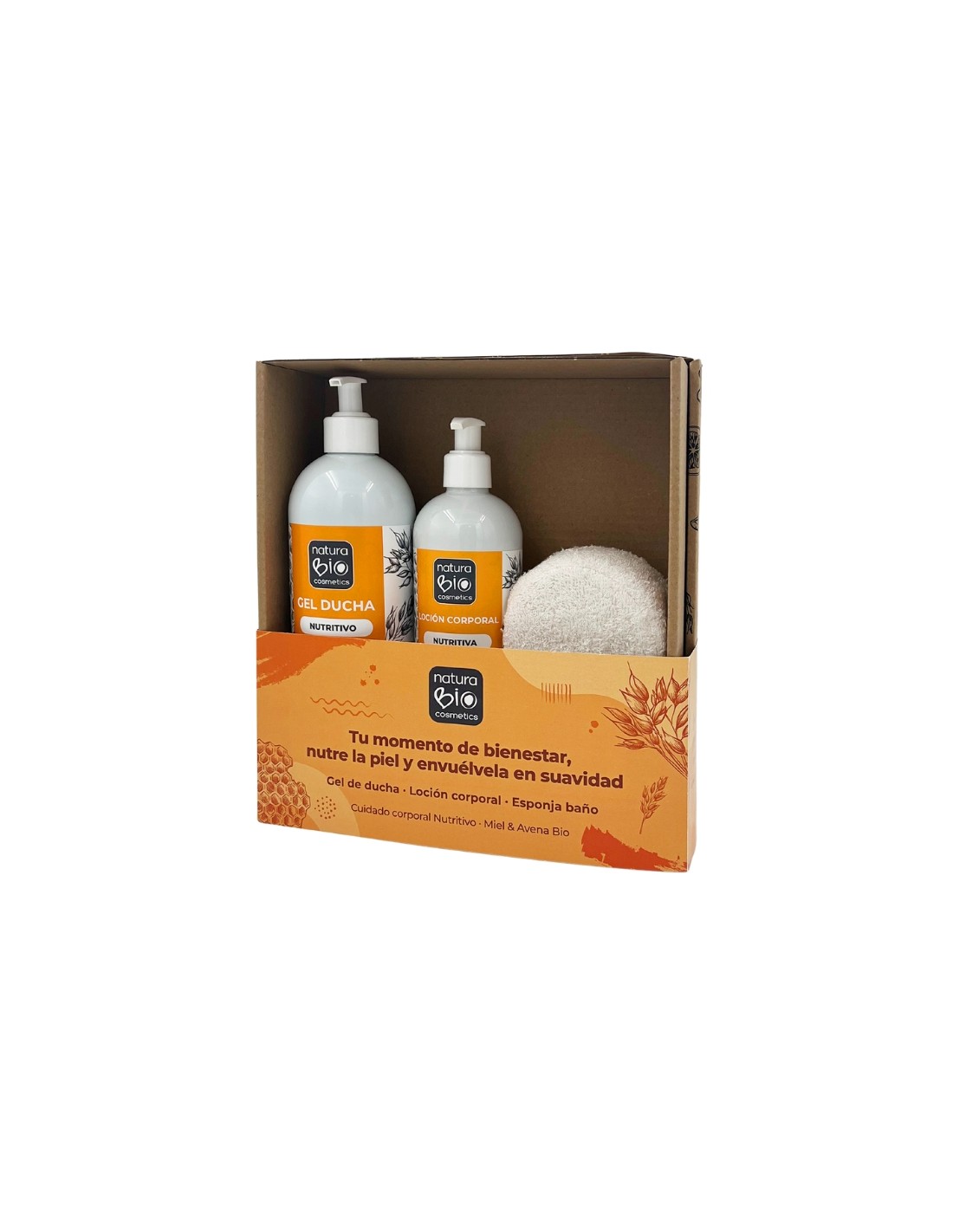 Incluye gel de ducha + loción corporal + esponja de baño, presentados en una caja de regalo reutilizable con imagen NaturaBIO Cosmetics.