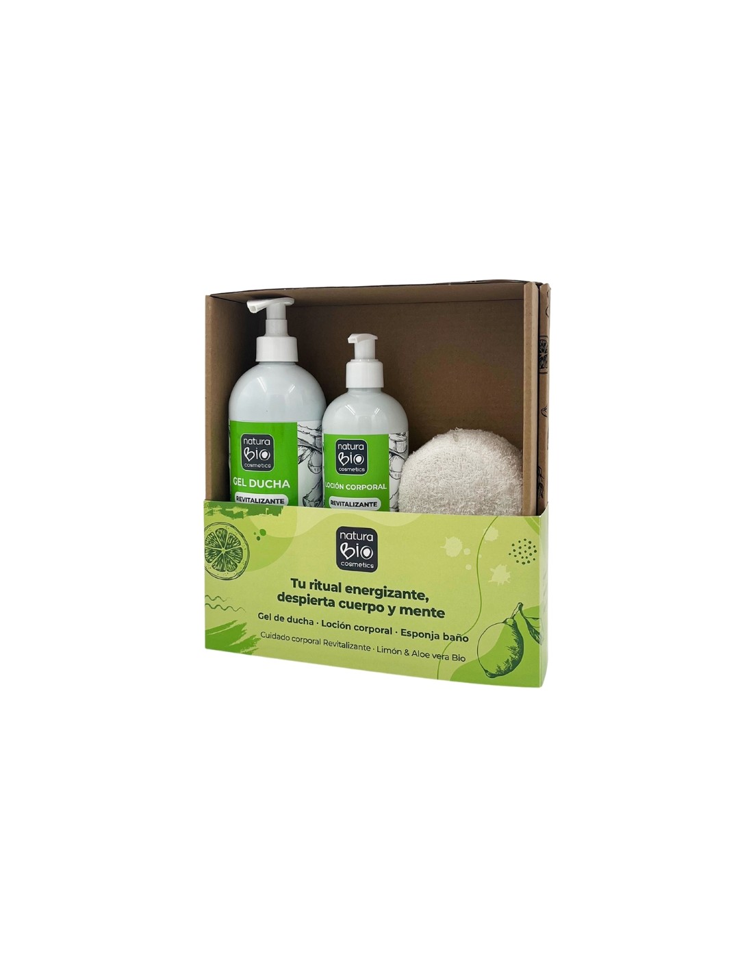 Incluye gel de ducha + loción corporal + esponja de baño, presentados en una caja de regalo reutilizable con imagen NaturaBIO Cosmetics.